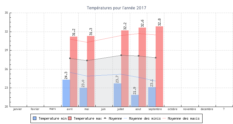 | septembre | 23.1 °C | 24.1 °C | 32.8 °C | 31.5 °C | 27.8 °C | 6.5 km/h | 53.1 km/h | 98 |